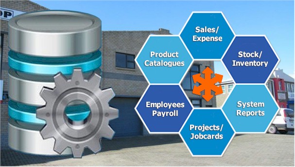 A database program is in essence a system that allows you to store information about personnel, stock items, etc. as well as track sales, progress of jobs, etc.
